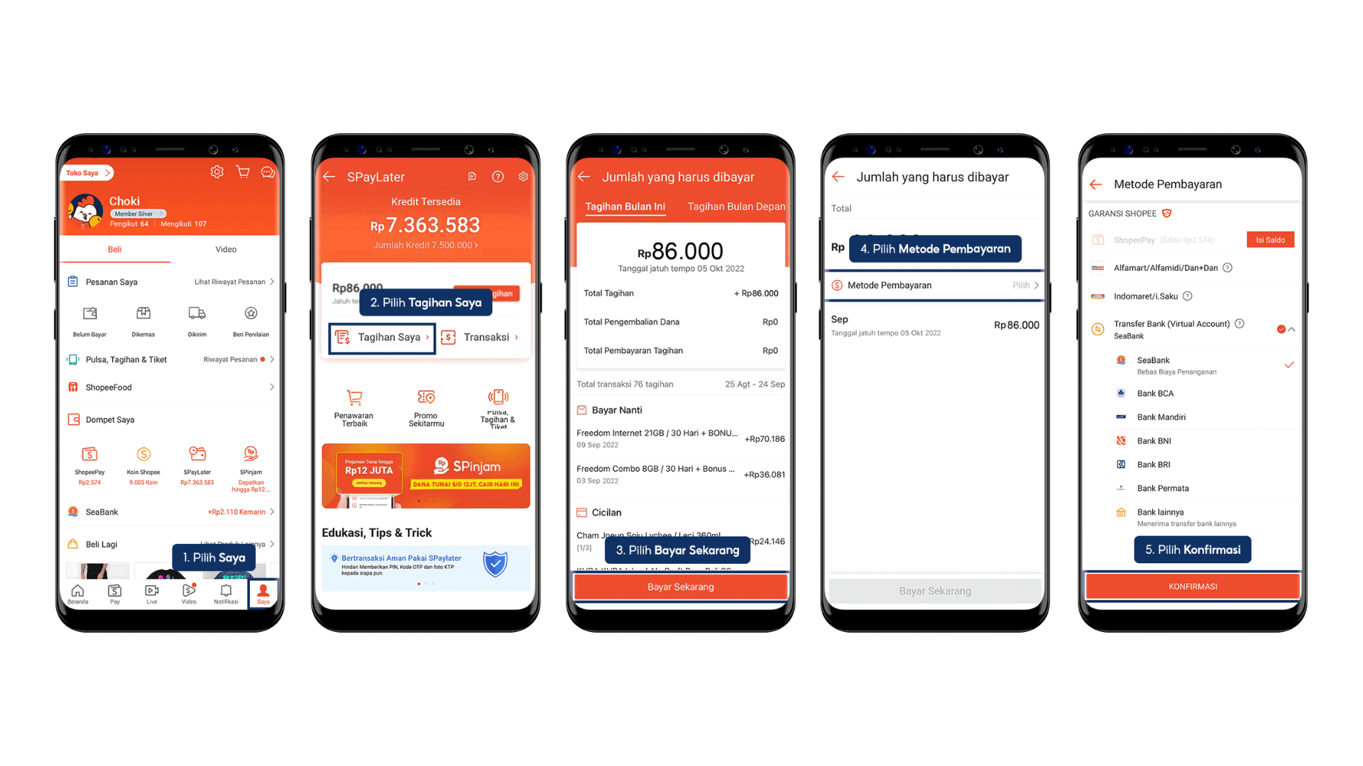 Anda dapat membayar tagihan SPayLater dengan memilih tab Saya pada halaman utama aplikasi Shopee atau ShopeePay > pilih SPayLater > pilih Tagihan Saya > pilih Bayar Sekarang > pilih Metode Pembayaran > pilih Konfirmasi > pilih Bayar Sekarang > lakukan pembayaran.